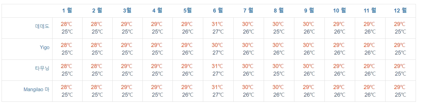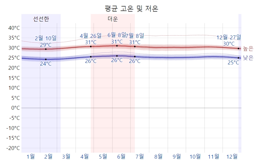 습도가 높은 편입니다. 1년 내내 습도가 70~80% 수준이라 무덥게 느껴집니다. 바람이 잘 통하는 옷을 준비하는 게 좋고, 호텔에서 에어컨은 필수입니다. 저는 처음 갔을 때 습한 날씨에 적응이 안 돼서 하루 이틀 고생했던 기억이 있습니다. 선크림과 모자는 필수 준비물입니다.