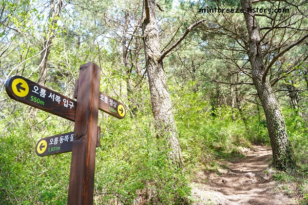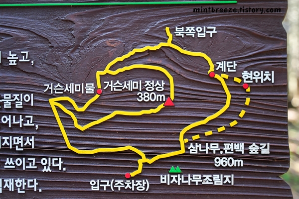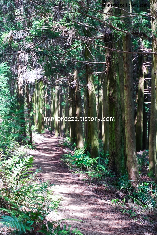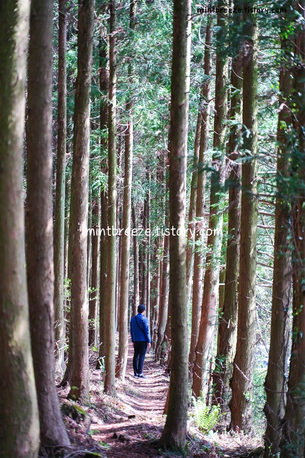 삼나무 편백 숲길 960m를 걸어 조금 빙 돌아서 정상까지 가는 방법이 있습니다. 저는 삼나무 편백 숲길쪽으로 걸었고 거슨세미 정상을 내려와 이후 반대편으로 걸어서 다시 입구 주차장으로 왔어요.